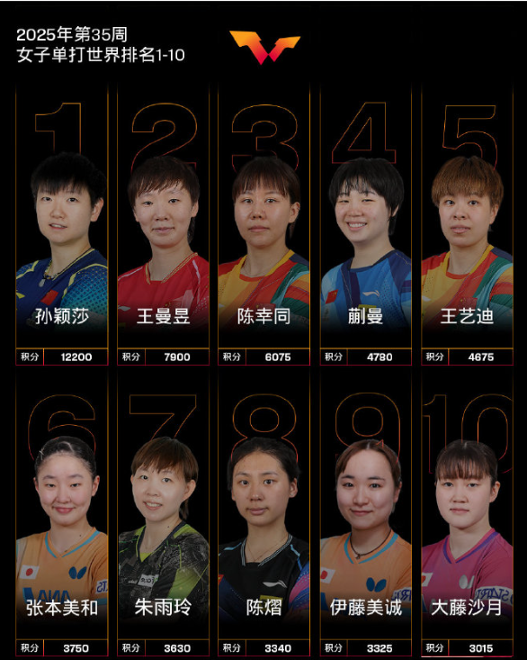 女单世界前十里有6位国乒选手,孙颖莎(1),王曼昱(2),陈幸同(3),蒯曼(4),王艺迪(5),陈熠(8)。很明显女单依旧被国乒所统治着。